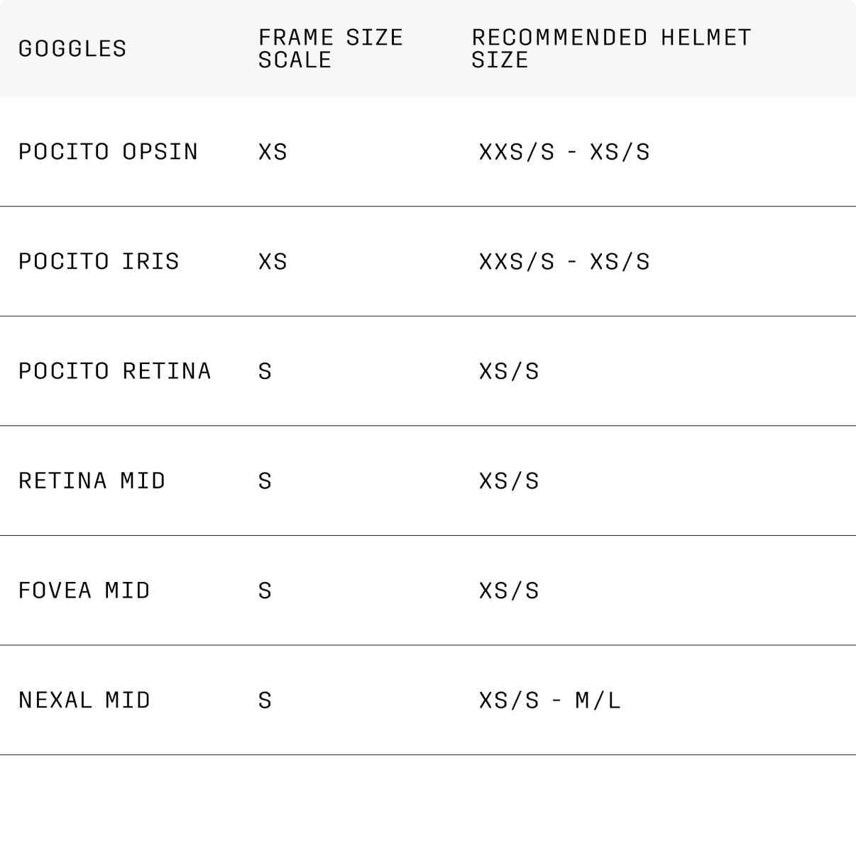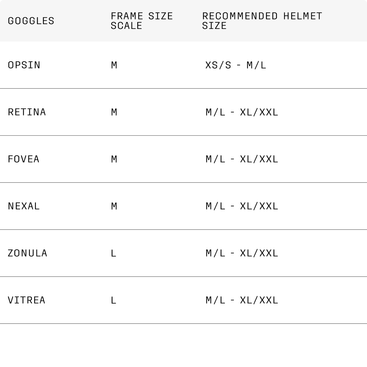 Use this table for inspiration and to discover which sizes of helmet work best with each goggle model. For each goggle model, the frame size is ranked, and recommended helmet size pairings are stated.