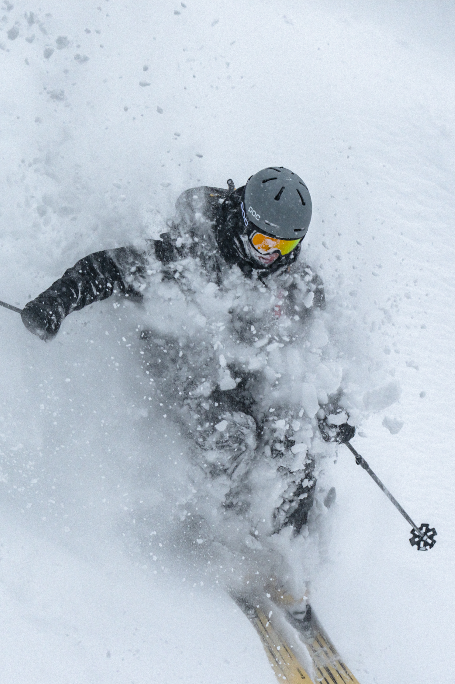 Woman wearing POC ski helmet and goggle