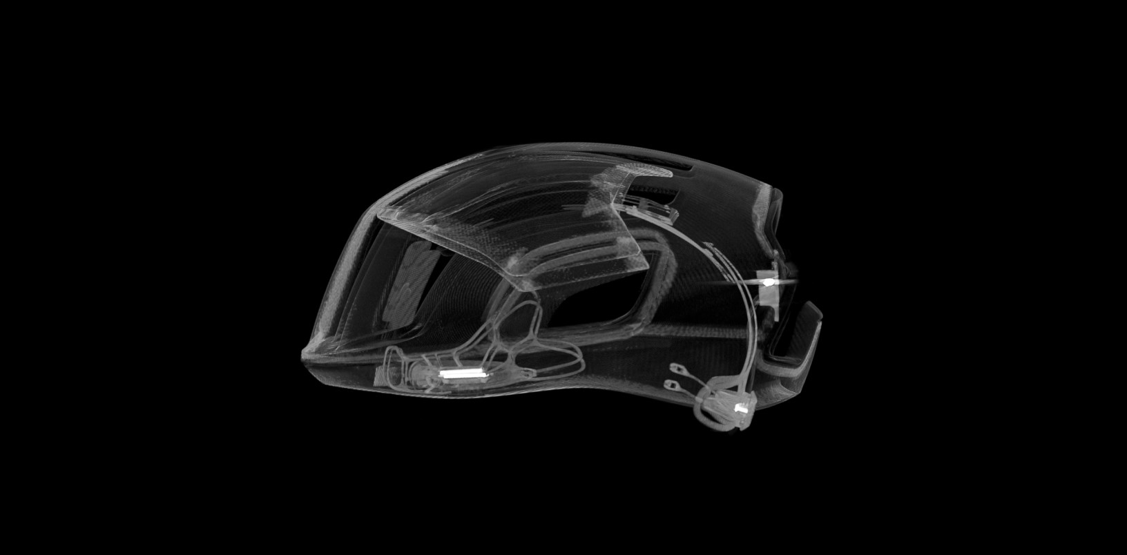 The size adjustment system, clearly shown in the x-ray, spans from temple to temple around the back of the head, keeping the front more open for better ventilation while also ensuring a secure fit.